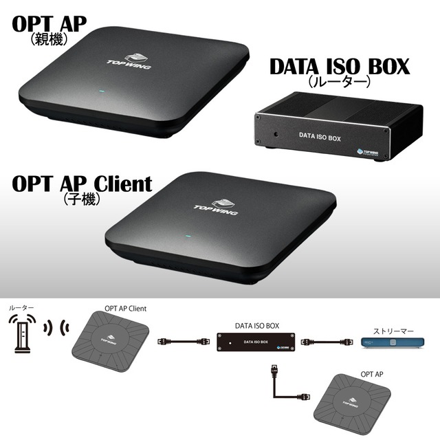 ※本商品はメーカー取寄せ品となります。 DATA ISO BOXとOPT APのセット購入でお得な価格となっております。 (参考)DATA ISO BOX価格:55,000円(税込) OPT AP価格:33,000円(税込) DATA ISO BOXの特徴 TOP WING DATA ISO BOXは、ネットワークオーディオに特化した「オーディオ専用ルーター」です。家庭内のネットワークに混在するモバイル端末や家電などの通信を遮断し、オーディオ機器のためだけの純粋なネットワーク空間を構築します。ネットワーク負荷によってネットワークオーディオ機器が発する電気的ノイズを抑制し、音質の向上と安定した動作を実現するのです。主な特徴は以下の通りです。 ◆一般ネットワークから完全分離されたオーディオ専用LAN構成 ◆業務用CPU・高信頼性SK hynix製メモリを採用した堅牢なハードウェア設計 ◆ネットワーク分離のために徹底的に最適化されたソフトウェア構成 ◆Roon ARC対応 OPT APの特徴 ネットワークオーディオにおいて「ネットワークを分けること」は、音質を引き出すうえで極めて有効な手段です。しかし、ネットワークを完全に分離してしまうと、スマートフォンやタブレットからのアプリ操作ができなくなるという問題が生じます。 この課題を解決するのが、TOP WING OPT APです。OPT APは、ネットワークオーディオ専用のWi-Fi親機(無線アクセスポイント)として開発され、DATA ISO BOXと組み合わせることで、オーディオ機器への通信負荷を最小限に抑えながら、操作性の自由度も両立します。主な特徴は以下の通りです。 ◆単体アクセスポイントとしてソフトウェアを最適化 ◆設定済み出荷のため、接続するだけで即使用可能 ◆Wi-Fi 6対応(最大2402+574Mbps)、160MHzチャンネル幅、2×2 MU-MIMO ◆LANポートに加え、将来的な光接続に対応したSFPポート搭載(DDM対応) DATA ISO BOXの仕様 入出力:LAN(RJ45)端子5ポート (内訳)オーディオ用3ポート、無線AP用1ポート、上位ルーター用1ポート 通信規格:Auto-negotiation 1000Mbps/100Mbps/10Mbps Full 入力電源:12V/1A, 2.1mm/5.5mmセンタープラス(ACアダプター付属) サイズ:128mm x 86mm x 34mm (幅x奥行きx高さ) 重量:243g OPT APの仕様 入出力:SFPポート/LAN(RJ45)ポート 通信規格:Auto-negotiation、SFPポート2.5/1Gbps、LAN(RJ45)1000/100/10Mbps 対応周波数帯域:2.4GHz / 5GHz(デュアルバンド) Wi-Fi規格:IEEE 802.11a / b / g / n / ac / ax(Wi-Fi 6) 暗号化方式:WPA-PSK/WPA2-PSK/WPA3-SAE対応 最大通信速度(理論値):2.4GHz帯:最大574Mbps、5GHz帯:最大2402Mbps チャンネル幅:最大160MHz対応(5GHz) MIMO構成:2×2 MU-MIMO(送信×受信) 入力電源:12V/1.5A, 2.1mm/5.5mmセンタープラス(ACアダプター付属) サイズ:192mm x 192mm x 38mm (幅x奥行きx高さ) 重量:502g