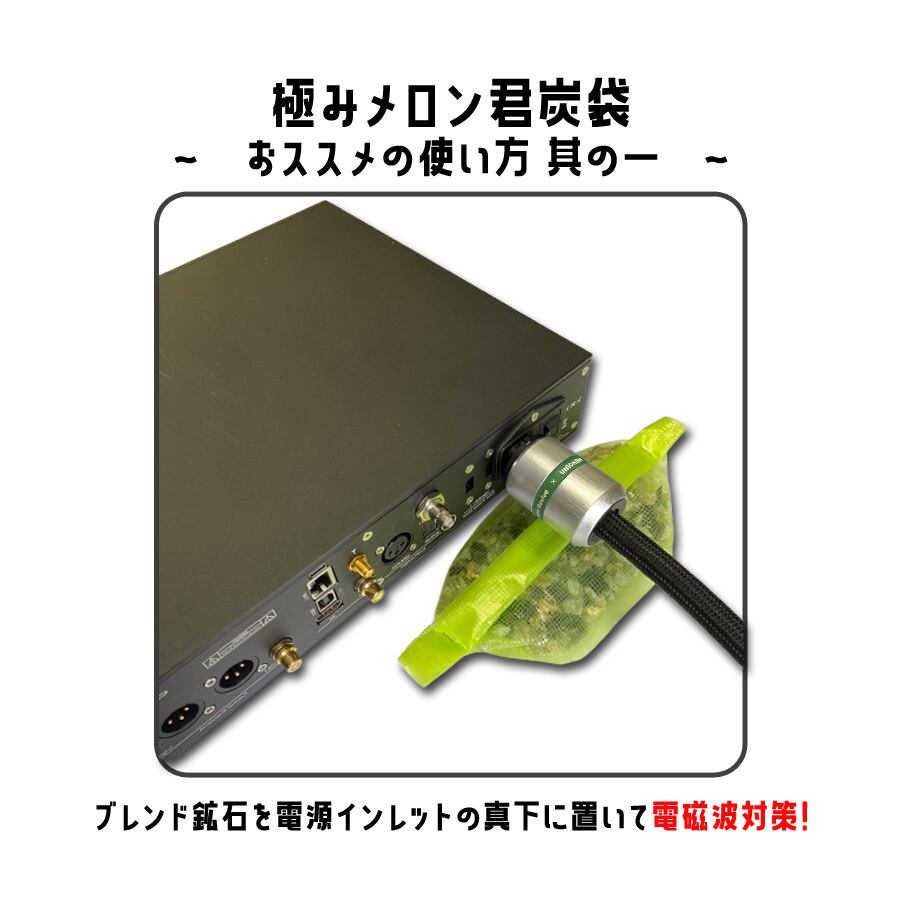 また、メロン君炭袋をケーブルインシュレーターとして設置することによって、電源ケーブルから放たれる微細な電磁波や振動対策となり、音のボアつきが取れ澄み切った輪郭のある音へと導いてくれます。