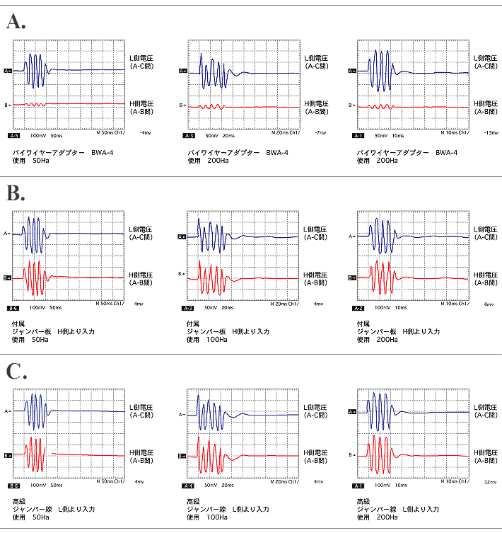 50Hz、100Hz、200Hzのトーンバースト信号を再生し、高域側端子に流れ込む逆起電力を測定しました。AがバイワイヤーアダプターBWA-4使用