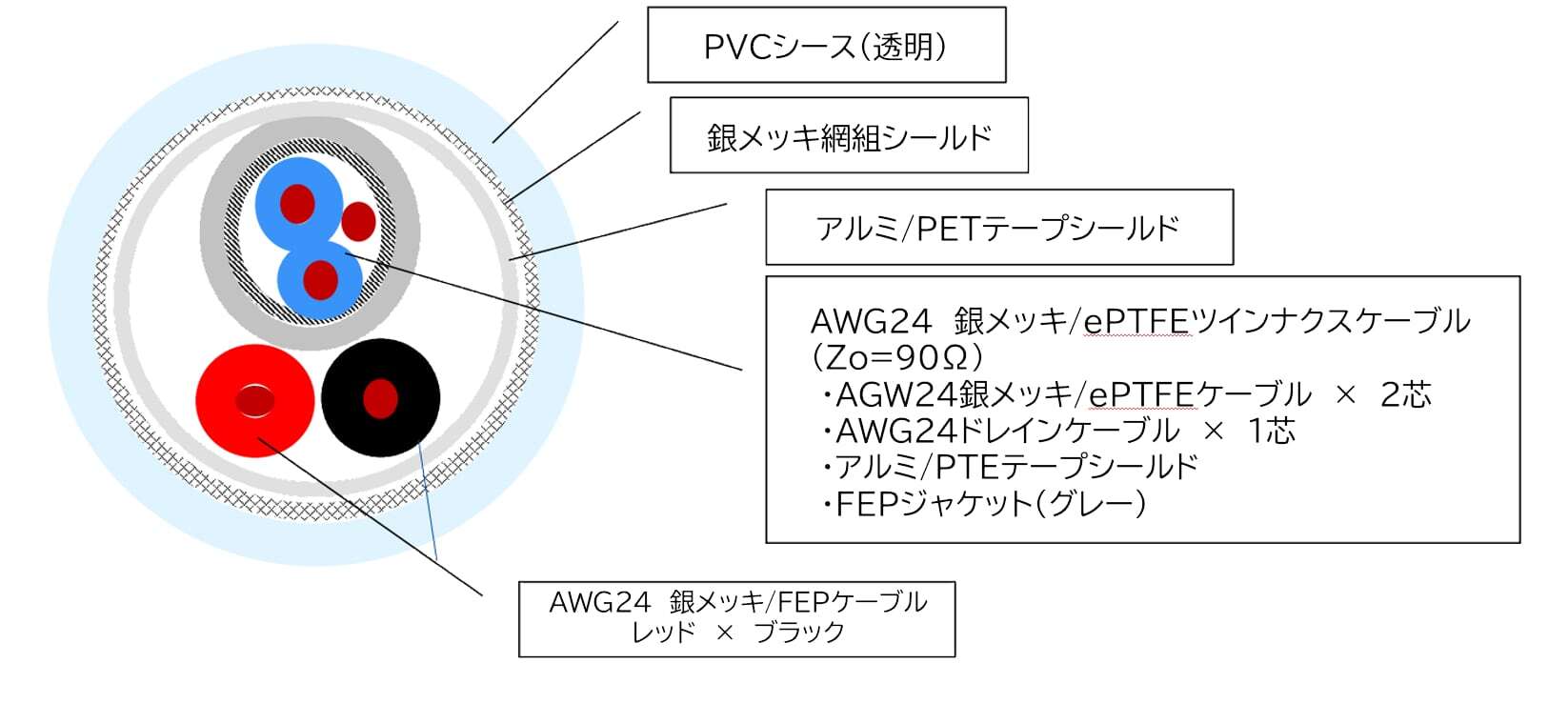 銀コートを施した高純度銅線をジュンフロンでタイトに包み、デジタル伝送に欠かせない低キュー、低ロスの高性能ケーブルとなっています。